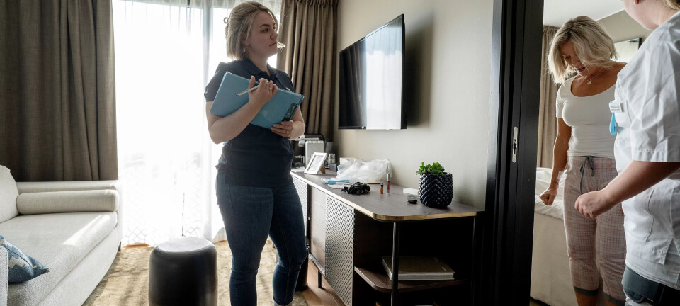 Scenen kunne vært henta fra en hvilken som helst hjemmetjeneste i et hvilket som helst land, men den sta og sure dama i senga er en oppfunnet karakter gestaltet av teamleder for yrkeslandslaget, Yvonne Soggemoen. Og soverommet er del av en suite på Lily Country Club på Kløfta. Her trener teamet til Straub til Yrkes-EM i september.