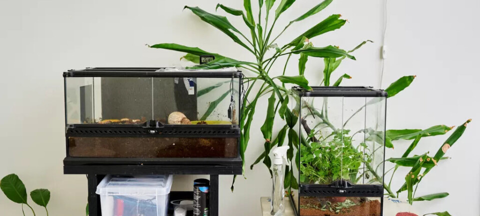 Hjemme prater hun med dem og stuller og steller rundt bordet på stua hvor terrariet troner. Av og til tar hun dem ut og setter dem på yogamatta på et fuktig håndkle.