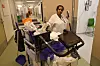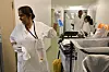 Fem kvitkledde sit inne på eit tomt reinvaska legevakt-rom. Ein av dei, Karen Alegre tek ordet: