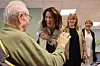 SJARM: Johhny Ringstad (81) bur på Lørenskog sykehjem og fekk besøk av arbeids- og inkluderingsminister Tonje Brenna (Ap), LO-leiar Kine Asper Vistnes og Fagforbundet-leiar Mette Nord. Ringstad fortalde at han har vore tillitsvald og medlem av foreininga Jern og metall, som seinare blei til Fellesforbundet. Der var Vistnes leiar til ho nyleg tok over LO-roret.Foto: Øystein Windstad