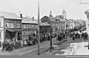 1908 1. mai. Demonstrasjonstoget passerer Youngstorget på sin vei nedover Torggata. I bakgrunnen det nye Folkets Hus. Paroler: 8 Timers Arbeidsdag - Arbeidere forener Eder - Bort med Overtidsarbeidet.