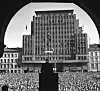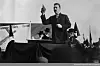 Oslo 1957 1. mai-feiring på Youngstorget. Dagens hovedtaler er statsminister Einar Gerhardsen (med ryggen til) . Han taler til folkemengd