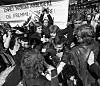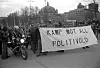 1978 Opptøyer i Oslo sentrum natt til 1. mai. Det ble sammenstøt mellom politiet og flere hundre ungdommer i Slottsparken. Politiet gikk til aksjon med hester og hunder for å rydde parken for ungdommer. Bildet viser ungdom med slagordet "Kamp mot all politivold". Foto Erik Thorberg / NTB / NTB
