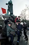 1991 Carl I. Hagen skal holde tale i Spikersuppa under Fremskrittspartiets 1. mai markering. Her fjerner politiet en av Blitz-demonstrantene før Hagen skal holde sin tale. Foto: Terje Bendiksby / NTB / NTB