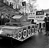 OSLO 1950 Første mai i Oslo. Norges Kommunistiske parti hadde eget 1.mai tog med egne plakater og paroler. Kommunistene var spesielt i mot den amerikanske våpenhjelpen. Her fra kommunistene sitt tog med en hjemmelaget amerikansk tanks / stridsvogn og plakat med teksten "Dette er ikke fredens verktøy" NTB / NTB