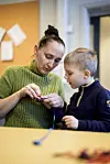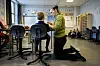 Snart ligger en guttegjeng rundt et sjakkbrett på golvet, mens to jenter tar fatt på dagens fingerheklingsprosjekt.