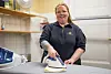 May Britt Nilsen bretter tøy i vaskeriet i kjelleren på Solvang helsehus. Hun har til sammen rundt ti års erfaring fra vaskeri.