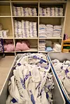 Så starter hun vaskemaskinene, og rulla, for den må ha tid til å varmes opp. Rulla bruker de til det meste. Tørketrommelen er bare til kokkejakkene. Til slutt er det bretting og pakking av tekstilene for å sende det tilbake.