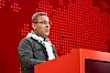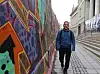 Ein mann med langt kvitt skjerf med svart rutemønster står på ei scene.