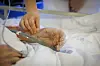 Mannen i senga ser skjør ut. Tynn hud omkranser de små sårene på armene.