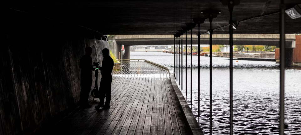 Tre lattermilde venninner stormer opp trappa fra brygga til Trelastgata. Tre unge menn står fortsatt tett sammen i mørket under brua. Kjappe hender utveksler noe, før de får øye på fotografens arbeidsverktøy og forsvinner opp i trafikkerte Eufemias gate.